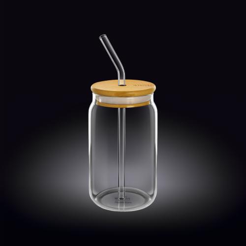 Банка для коктейля 330 мл. d=60 мм. h=130 мм. с дерев. крышкой, с трубочкой Термостекло Wilmax /1/48/