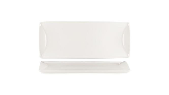 Блюдо прямоугольное белого цвета со сливочным оттенком.
