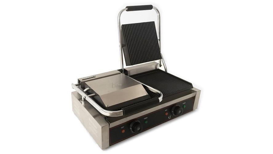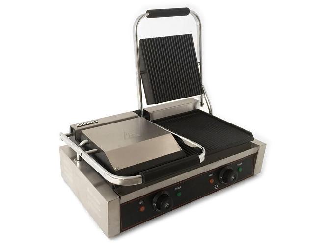 Гриль предназначен для жарки мяса, птицы, рыбы, овощей, а также для приготовления стейков, гамбургеров и горячих сэндвичей на предприятиях общественного питания и торговли. Высокая скорость приготовления достигается благодаря встроенным в обе части аппарата тепловым элементам, которые плотно прилегают к продукту. Модель оснащена терморегулятором и съёмным поддоном для сбора жира и крошек. Корпус выполнен из нержавеющей стали, жарочная поверхность - из чугуна с антипригарным покрытием.